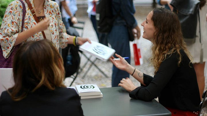 E poi Milano, con tante voci, domande importanti tipo “ma si può ancora fare questa rivoluzione?” e occhi lucidi, e Forlì, con decine di studentesse e studenti curiosi e coraggiosi. Bologna, dove la natura si è imposta prepotentemente, e la grandine all’inizio non ci ha permesso di parlare, e poi Roma, che invece si è aperta ed è spuntato un inaspettato sole. Amore dappertutto. Amiche e amici che avvolgono, gioiscono per te, ti regalano fiori, e tu li lasci fare, soprattutto quei pezzi di cuore che si hanno dentro sempre ma che vedi e con cui parli poco, che ora spuntano e abbracciano e condividono. Già solo per questo ne varrebbe la pena. E poi le persone. Quelle che vengono ad ascoltare, con occhi pieni di curiosità e per le mani tante piccole potenziali rivoluzioni, che comprano copie per sé, per i fidanzati, per le mogli e le figlie. Soprattutto le figlie. Per le quali sto provando a scrivere le migliori dediche che posso. Che strane e belle cose le dediche agli sconosciuti, che regalo meraviglioso del reale.